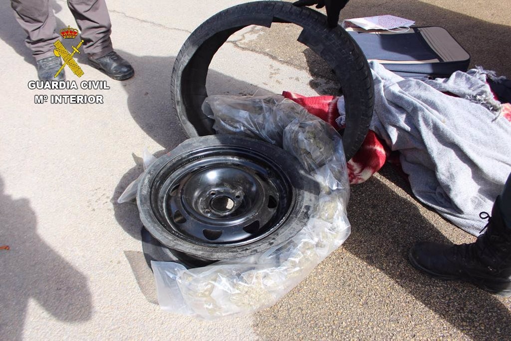 Los agentes actuantes se centraron en el maletero, una vez inspeccionaron el fondo encontraron unas bolsas verdes en el hueco de la rueda de repuesto, así como en el interior de la misma, hallando hasta un total de 8,600 kilos de marihuana.