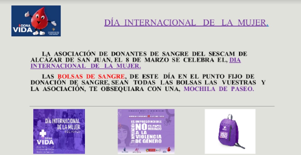 La Asociación de Donantes de Sangre del Sescam de Alcázar de San Juan ha realizado, para el día 8 de marzo, Día de la Mujer, un llamamiento a las mujeres para que acudan a donar a su Punto Fijo de Donación de Sangre para esta jornada. En este día, se obsequiará con una mochila de paseo.