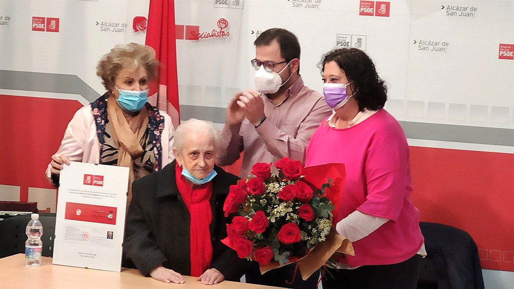 Por esta “lección de vida” y por los años dedicados a trabajar por la Agrupación socialista, el PSOE de Alcázar le ha rendido homenaje en 2022 en el Día de la Mujer; entregándole un ramo de rosas rojas y una reproducción ampliada del antiguo carnet del PSOE, en el que aparece su fotografía y la fecha en la que se afilió, el 12 de enero de 1978, aunque su militancia activa venía de mucho antes.