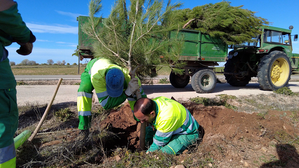 60 ejemplares de pino halepensis, intercalado con cipreses, se están plantando estos días en el último tramo del Camino de San Isidro que aun estaba sin vegetación.