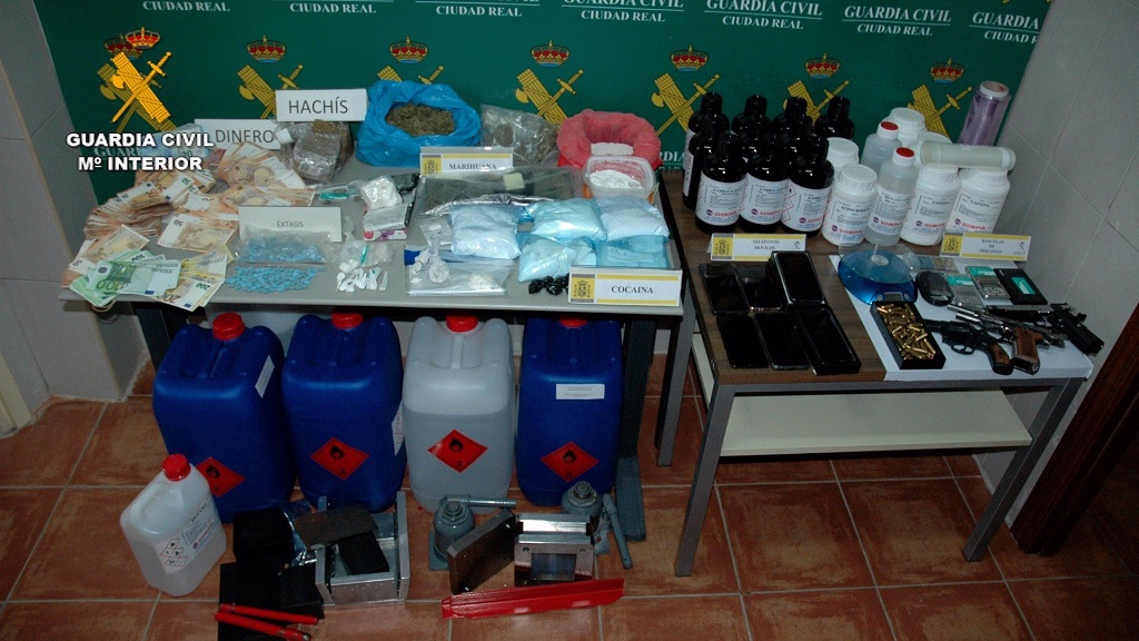 Durante los registros llevados a cabo se aprehendieron 1.616 gramos de cocaína, 1.205 gramos de hachís, 500 gramos de marihuana, 17 gramos de Cristal, 27 gramos de heroína y 459 pastillas de éxtasis; así como 36.400 euros, precursores y sustancias de corte, básculas de precisión, prensas mecánicas, teléfonos móviles, pistolas simuladas y 3 vehículos a motor.