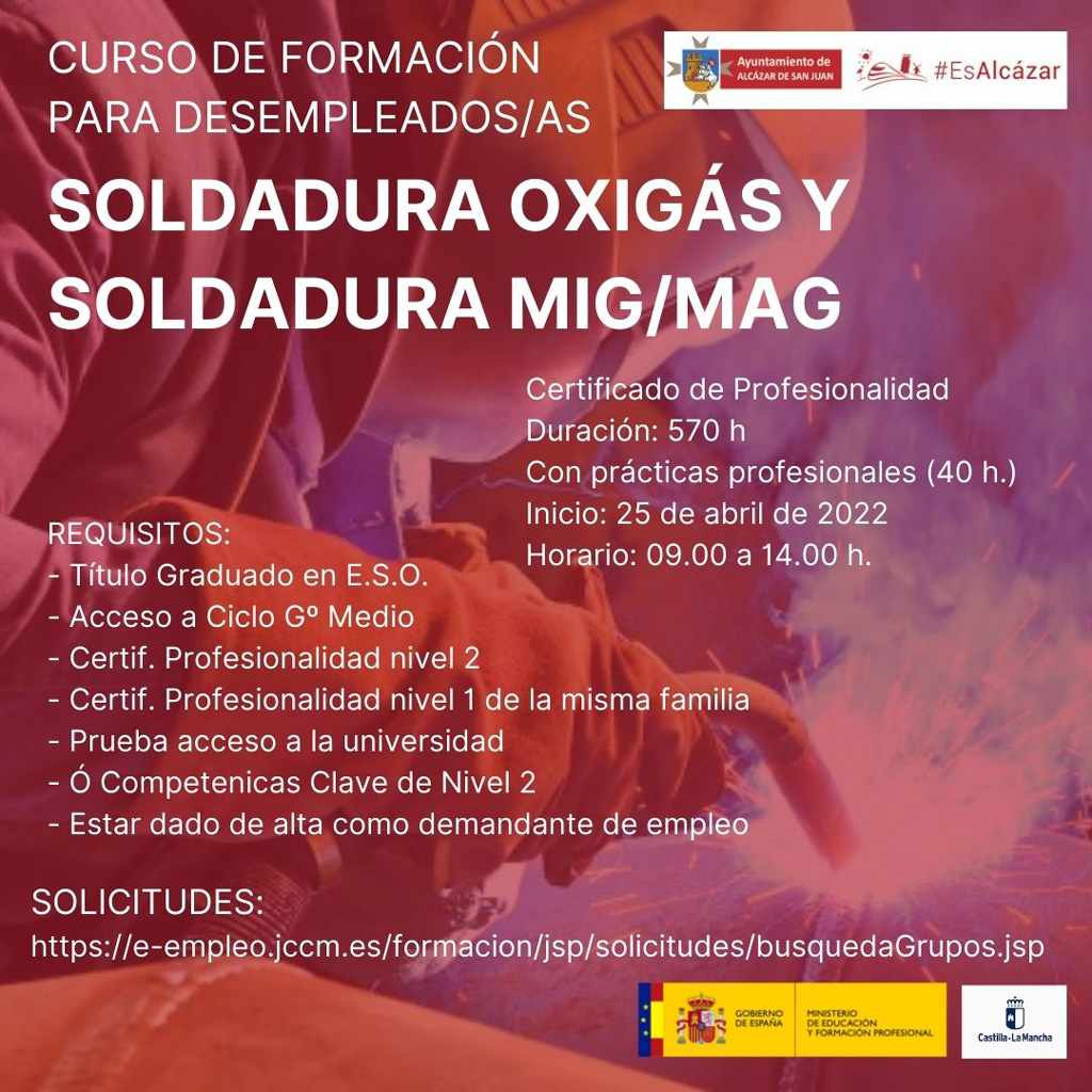 El Servicio de Formación para el Empleo del Ayuntamiento de Alcázar de San Juan está ofertando de manera gratuita el Curso para la obtención del Certificado de Profesionalidad de Soldadura Oxigás y Soldadura MIG/MAG, homologado por la Junta de Comunidades de Castilla La Mancha y el Servicio Público Estatal de Empleo. Este curso, que se realizará en las instalaciones del Centro de Empresas, está dirigido preferentemente a personas en situación de desempleo y su fecha de inicio es el 25 de abril de 2022. Tendrá una duración de 570 horas, en horario de 09.00 a 14.00 horas, de lunes a viernes.