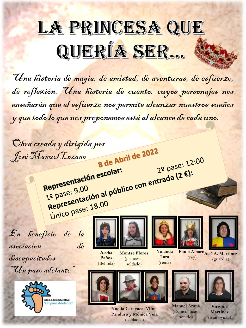 ‘La princesa que quería ser…’ tendrá dos pases, uno en horario de mañana para el público escolar del Centro Educativo y un segundo pase a las 18.00 horas para el público general, con entrada al precio de dos euros que irá destinada íntegramente a la asociación de discapacitados ‘Un paso adelante’ de Miguel Esteban.