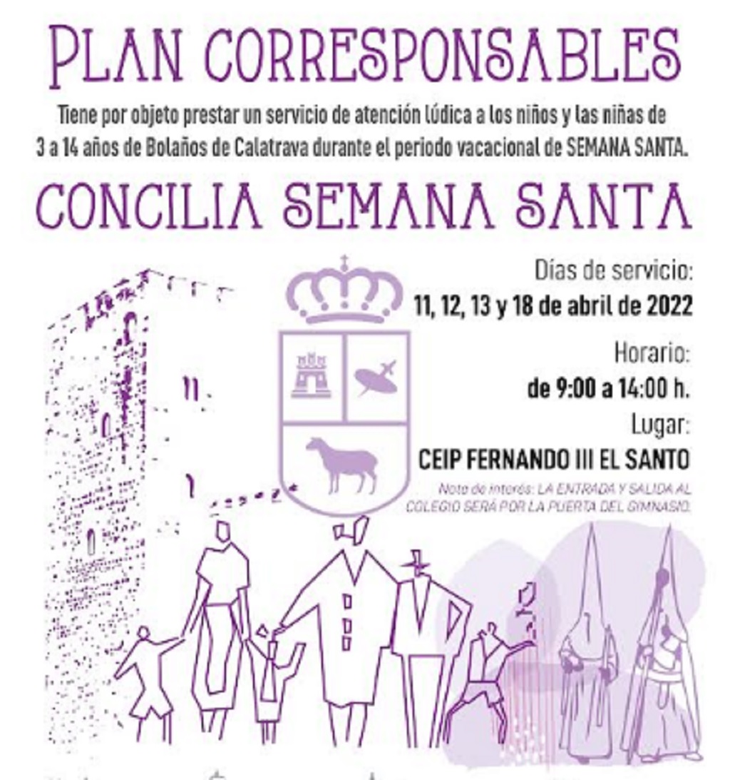 Un año más, el Ayuntamiento de Bolaños de Calatrava, a través del área de la Mujer, organiza dentro del programa Concilia, que se enmarca en el plan ‘Corresponsables’, un servicio lúdico y gratuito de atención a menores de 3 a 14 años durante los días no lectivos de Semana Santa y en horario escolar.