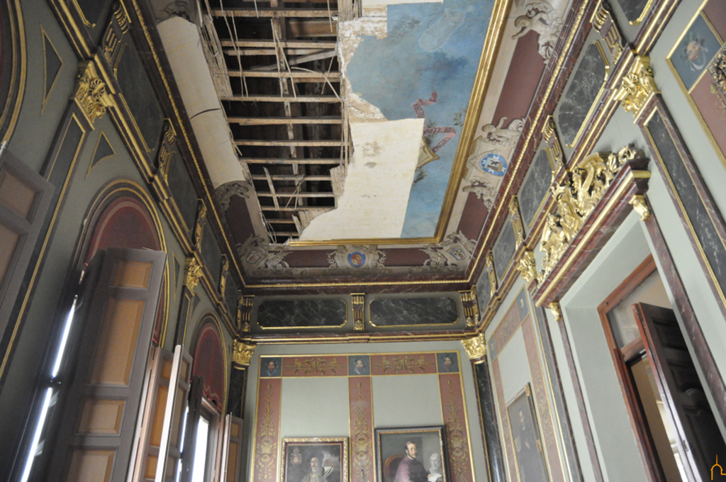 Parte del falso techo del salón de recepciones de la Diputación de Ciudad Real, una de las estancias más representativas del valor patrimonial, artístico y cultural que atesora el Palacio Provincial, se ha desprendido en un momento indeterminado desde la tarde-noche del pasado viernes a primera hora de hoy.