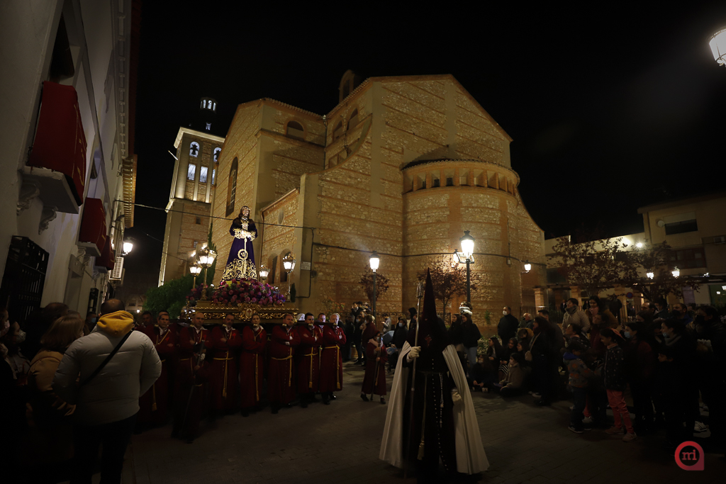 Tras una multitudinaria función religiosa oficiada por los sacerdotes, Trinidad Gallego y Francisco García Poveda, y celebrada en la ermita de la Veracruz, las imágenes de Jesús Rescatado de Medinaceli y María Santísima de la Redención, ambas pertenecientes a la Cofradía del Cristo de la Columna, volvían a salir a la calle en la noche del Martes Santo, tras dos años sin procesionar por la pandemia.