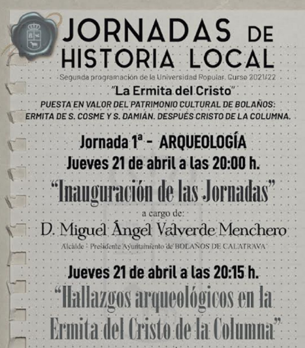 La Ermita del Cristo de la Columna de Bolaños acogerá este jueves, a las 20:00 horas, las Jornadas en torno a esta antigua Ermita de San Cosme y San Damián, programadas en un inicio para marzo de 2020, pero la pandemia las dejó paralizadas por la situación sanitaria. Se trata de una actividad desarrollada por el Ayuntamiento de Bolaños a través de la Universidad Popular, para poner en valor la historia, cultura y patrimonio de la localidad a través de diferentes ponencias, donde los especialistas en la materia exponen trabajos de investigación que han desarrollado en torno a estos temas.
