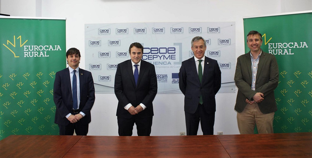 En el acto han estado presentes el presidente de Eurocaja Rural, Javier López Martín, acompañado del director territorial de Eurocaja Rural en Cuenca, José Manuel Poyatos Cabrera, y el presidente de CEOE CEPYME Cuenca, David Peña López, acompañado del director del Departamento Económico de CEOE CEPYME Cuenca, Miguel Angel Santos.