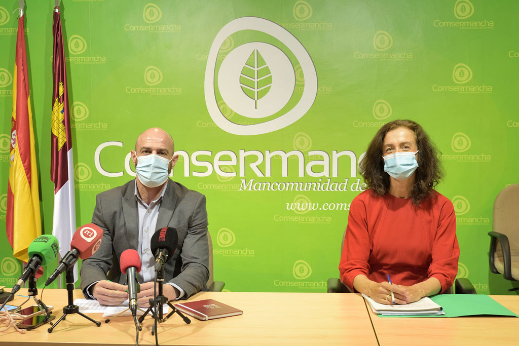 El presidente de la Mancomunidad de Servicios Comsermancha, Pedro Ángel Jiménez, junto a la responsable de la dirección local y autonómica de ECOEMBES en Castilla-La Mancha y otras comunidades autónomas, Clara Fernández, ha presentado en la sede de la Mancomunidad en Alcázar de San Juan, el convenio para la mejora de la contenerización de recogida selectiva de envases ligeros y papel-cartón entre Comsermancha y ECOEMBES. Asimismo, el presidente ha informado de los datos de recogida selectiva en los contenedores azul y amarillo durante el ejercicio 2021.