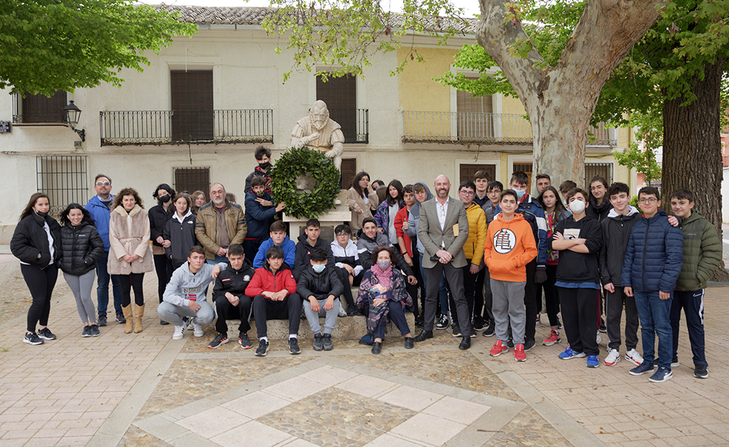 El IES Vicente Cano y Los Académicos de la Argamasilla homenajean a Cervantes con la lectura de los sonetos y epitafios frente a su estatua en la plaza de Alonso Quijano