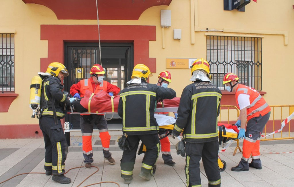 Una actividad en la que un derrumbe y un posterior incendio en las dependencias de la Comisaría de Alcázar, con varias personas heridas, alertaba a los vecinos ante la realidad de este simulacro en el que han participado, además de agentes de la Policía Nacional, varias dotaciones de Bomberos, personal sanitario y miembros de Cruz Roja.