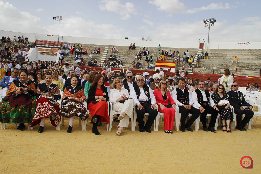 Una celebración que volvía a la Plaza de Toros de la localidad, tras el tradicional pasacalles, en el que participaron un total de cinco agrupaciones procedentes de distintos puntos de la geografía regional y nacional: el grupo anfitrión Virgen de los Ángeles, tanto en su sección infantil como adulta, la Asociación Cultural Folklórica “Aires de Moral “ de Moral de Calatrava, la Asociación Cultural de Coros y Danzas “Barro Tinajero” de Villarrobledo y el Grupo “Baluarte Aragonés” de Zaragoza, así como la Banda Sinfónica Municipal, que fue la encargada de interpretar el himno de Pedro Muñoz, ante las miles de personas que llenaron el coso pedroteño.