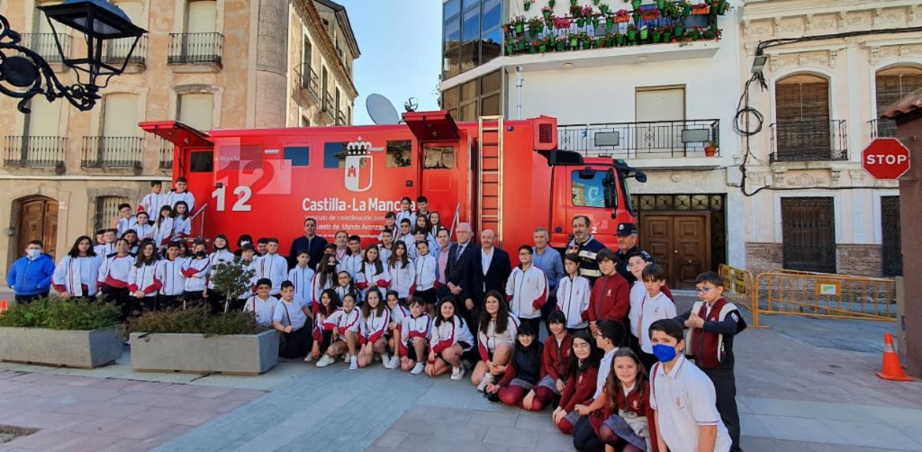 La segunda parte de la visita de los técnicos del 1-1-2 se lleva a cabo utilizando el vehículo de coordinación del Servicio de Emergencias que, para la ocasión, ha quedado aparcado en el centro de Herencia, con el fin de facilitar la llegada del alumnado al camión de comunicaciones.