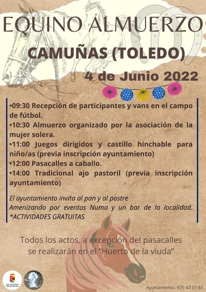 La localidad toledana de Camuñas acogerá, el próximo 4 de junio, un almuerzo equino con múltiples actividades divididas en una mañana que concluirá con un tradicional ajo pastoril. Este es el elenco de actos a realizar:
