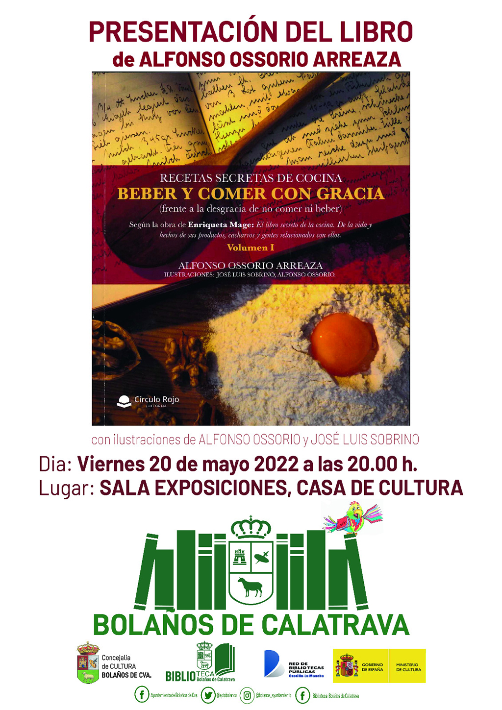 La Casa de Cultura de Bolaños acogerá este viernes 20 de mayo, a las 20:00 horas, la presentación del nuevo libro ‘Beber y comer con gracia (frente a la desgracia de no comer ni beber)’, del autor local Alfonso Ossorio Arreaza, inspirado en el libro ‘Secreto de la cocina’, de Enriqueta Mage. Además, el acto contará con la presencia del concejal de Cultura del Ayuntamiento de Bolaños, Felipe López, que acompañará al autor como en anteriores ocasiones.