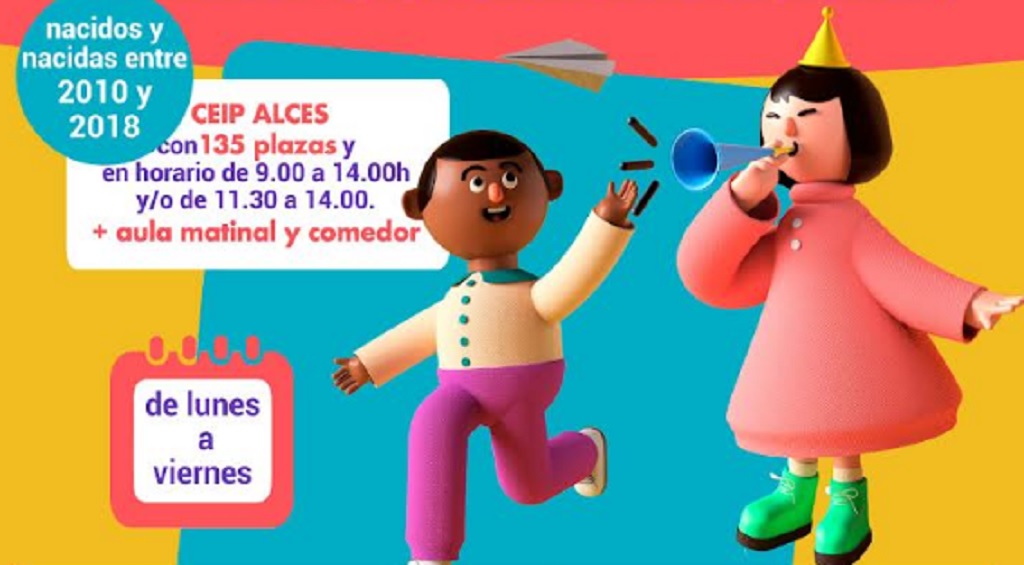 Es un servicio de Apoyo colectivo lúdico y social dirigido a niños y niñas que nacieron entre 2010 y 2018, donde se desarrollan actividades y talleres de ocio y tiempo libre con el fin de dar cobertura a los meses de julio y agosto. Este programa se desarrolla en el CEIP ALCES con una oferta de 135 plazas y en horario de 9 a 14h y/o de 11.30 a 14.00.