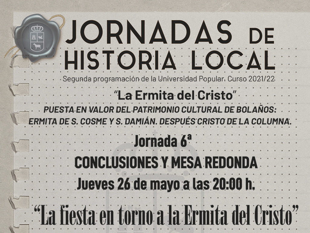 La Ermita del Cristo de la Columna acogerá este jueves, a las 20:00 horas, la clausura de las Jornadas de Historia Local para su puesta en valor, organizadas por el Ayuntamiento de Bolaños, impulsadas por el Archivo Municipal y la Universidad Popular. El cierre consistirá en una mesa redonda moderada por el historiador local, Alfonso Ossorio.