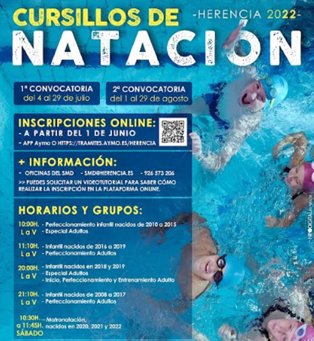 Una vez se ha hecho pública la apertura de la Piscina Municipal para esta temporada estival, un año más el Servicio Municipal de Deportes del Ayuntamiento de Herencia lanza la oferta de los distintos cursillos de Natación para esta temporada 2022.