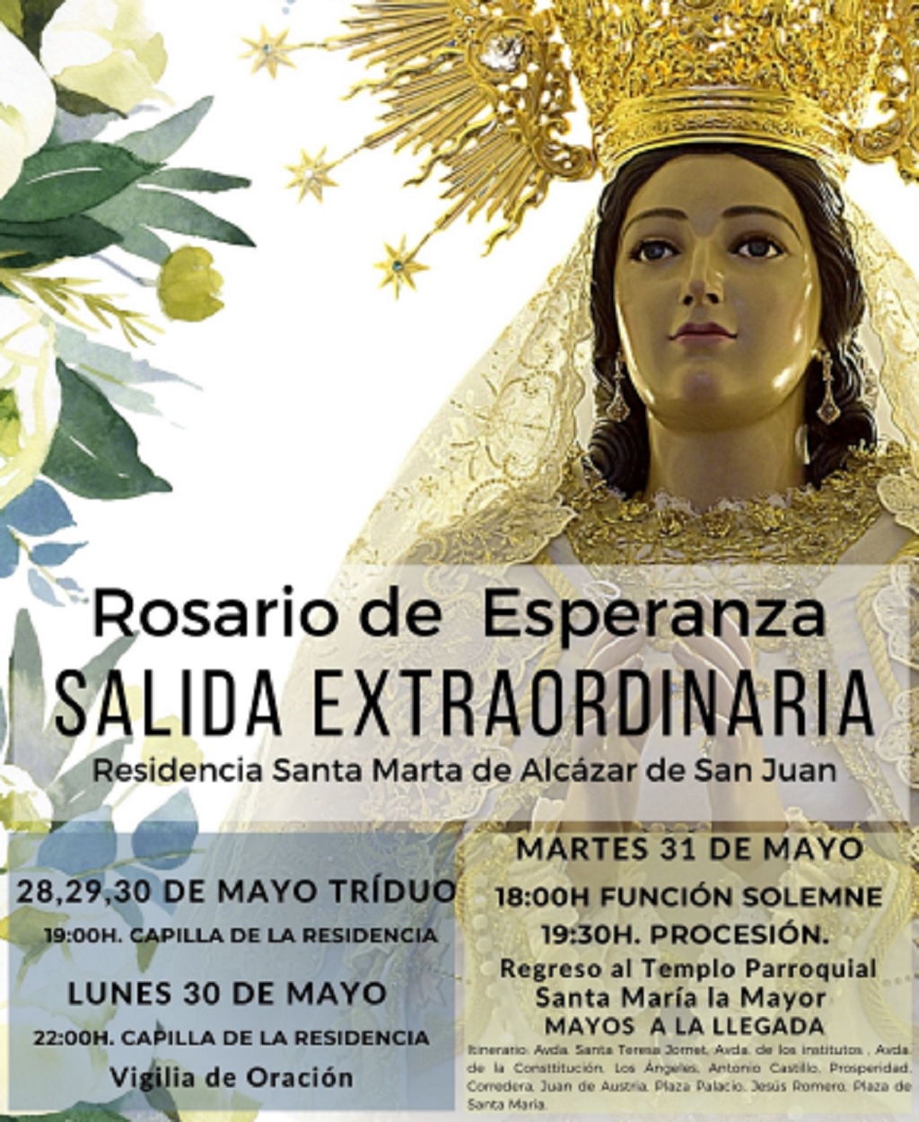 La Hermandad de la Virgen del Rosario de Alcázar de San Juan ha programado un Rosario de Esperanza en salida extraordinaria a la residencia Santa Marta alcazareña con la imagen de su titular para el próximo martes, 31 de mayo.