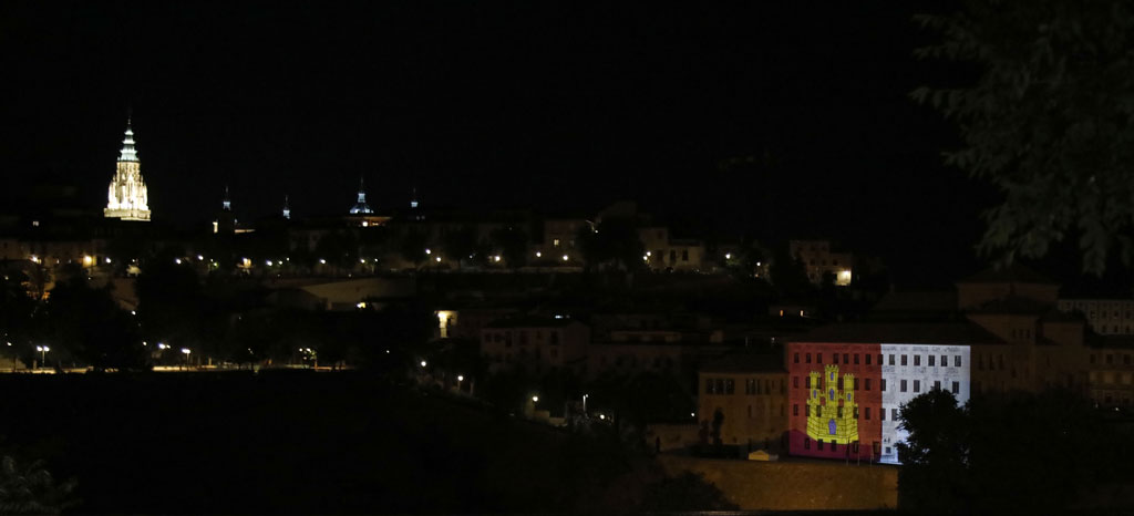 La fachada de las Cortes de Castilla-La Mancha, en el Convento de San Gil de Toledo, se ilumina a partir de esta noche y durante las próximas hasta el 31 de mayo, Día de Castilla-La Mancha, con una imagen de la bandera autonómica en movimiento, en una de las actividades con las que el parlamento presidido por Pablo Bellido se adhiere a la festividad regional del martes.