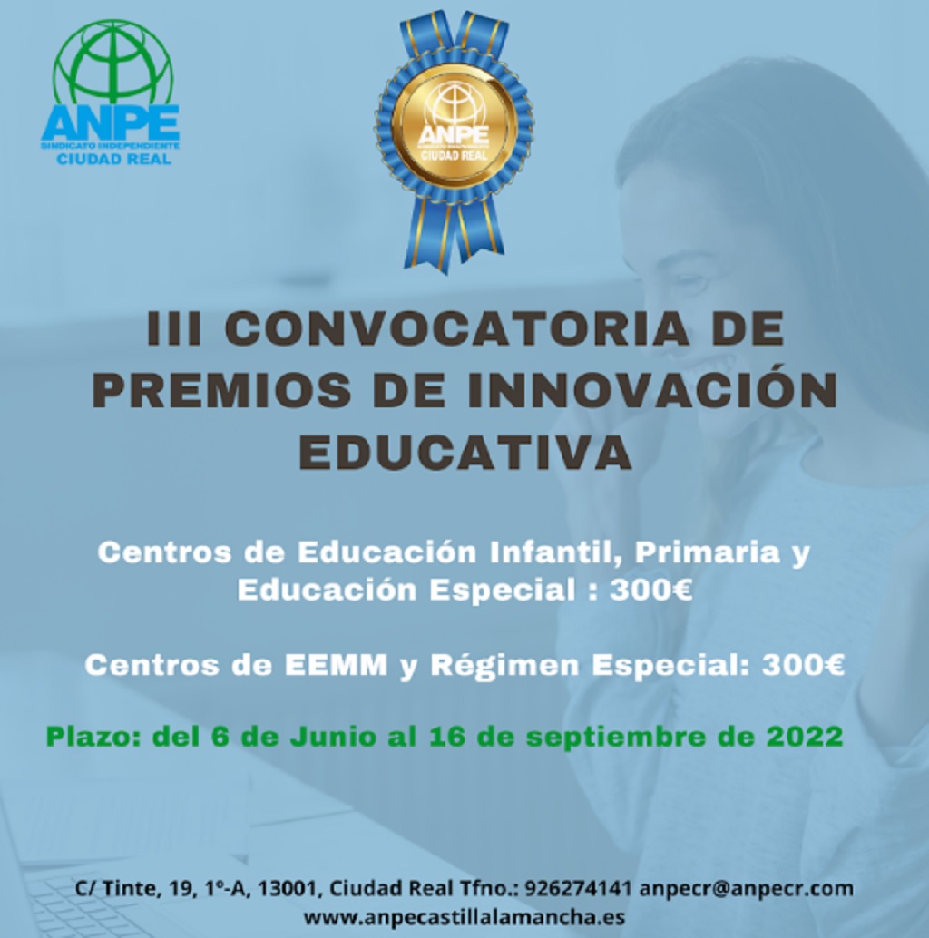ANPE ha puesto en marcha el la III edición del Premio de Innovación Educativa “Paco Diestro”. “Para nosotros es un orgullo volver a convocar el Premio de Innovación Educativa “Paco Diestro”, por dos razones fundamentales. Por un lado, reconocer el buen hacer de los docentes de nuestra provincia y por otro, recordar y homenajear a nuestro compañero Paco Diestro” afirma Mónica Sánchez de la Nieta, presidenta del sindicato.