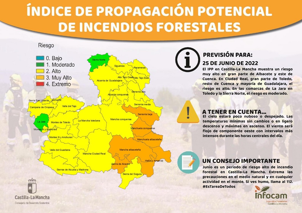 Este es el Índice de Propagación Potencial de Incendios Forestales (IPP) para mañana 25 de junio de 2022 en Castilla-La Mancha.