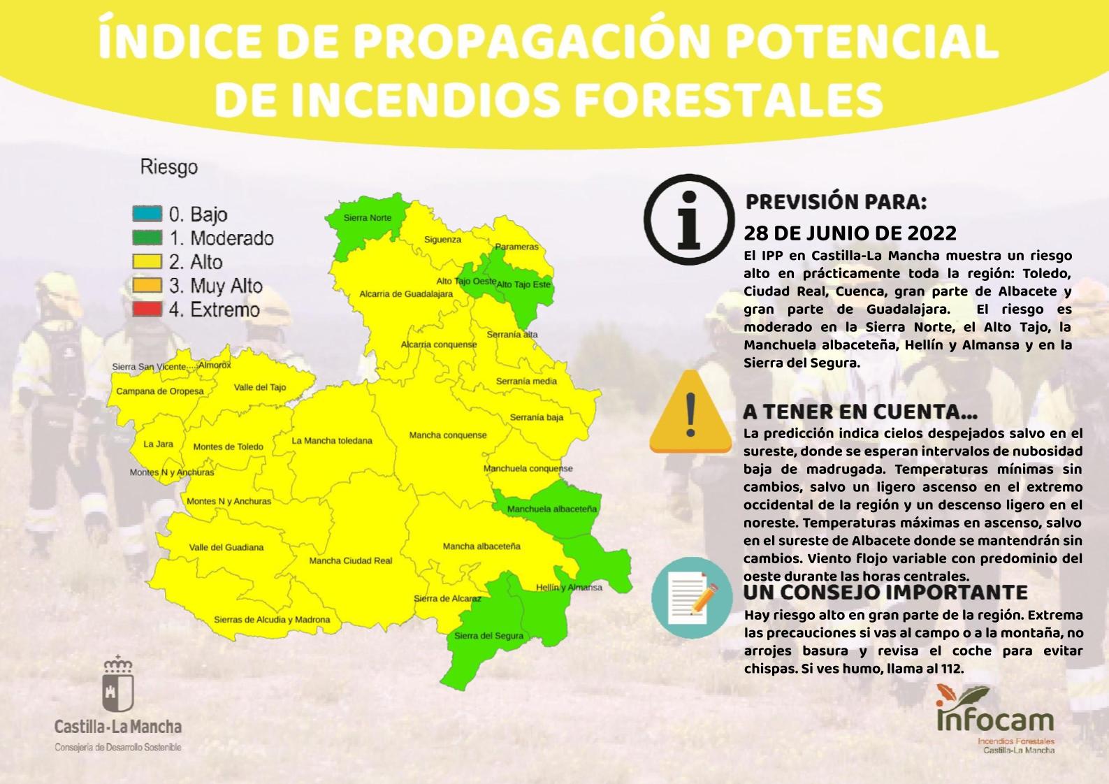 Este es el Índice de Propagación Potencial de Incendios Forestales (IPP) para mañana 28 de junio de 2022 en Castilla-La Mancha.