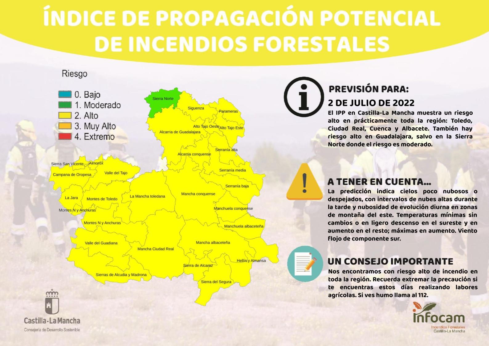 Previsión del Índice de Propagación Potencial de Incendios Forestales (IPP) para mañana 2 de julio de 2022 en Castilla-La Mancha.