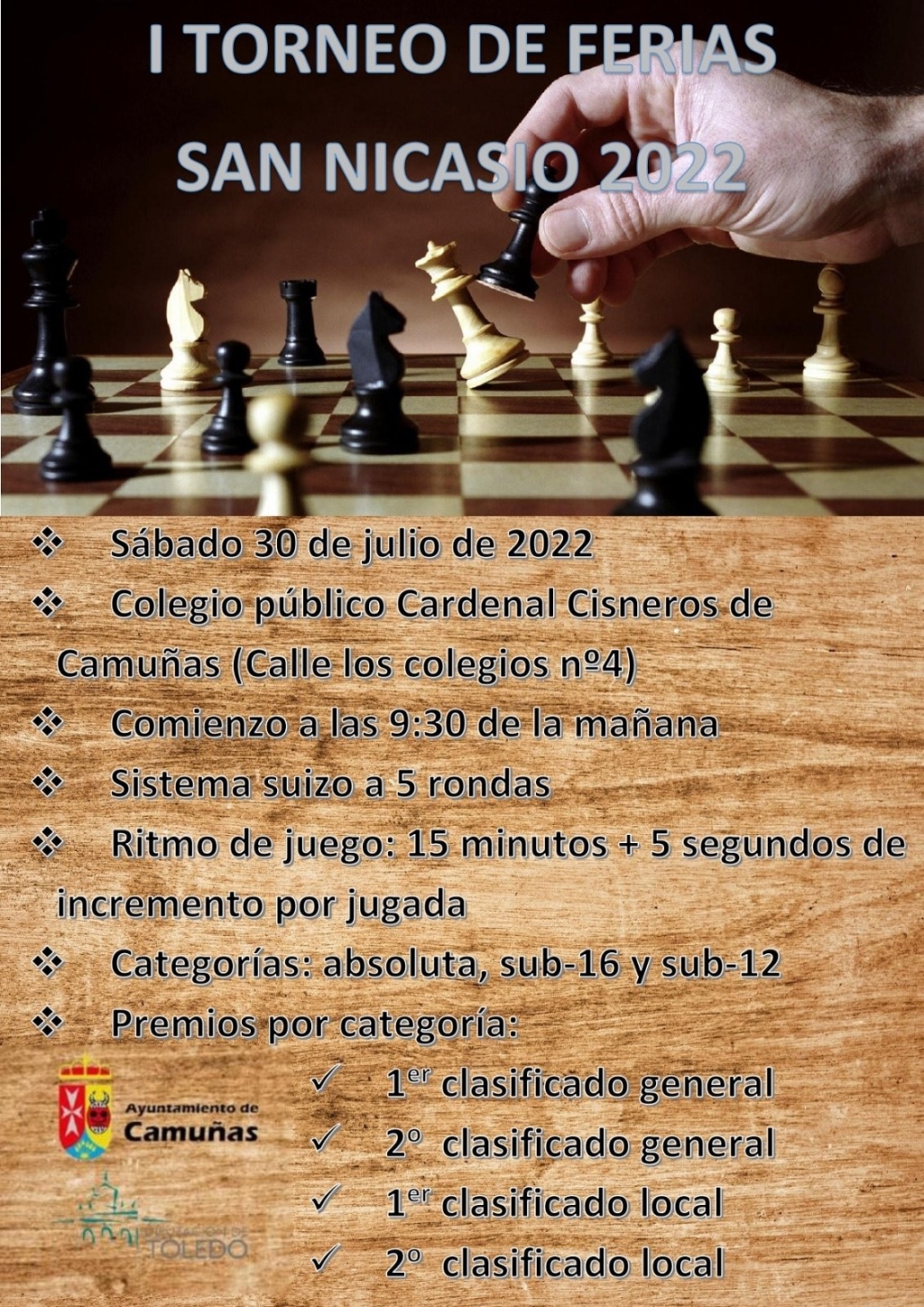 Camuñas acogerá, el próximo sábado 30 de julio en el colegio público Cardenal Cisneros (situado en la calle Los Colegios número 4) el I Torneo de Ferias de ajedrez “San Nicasio” 2022.