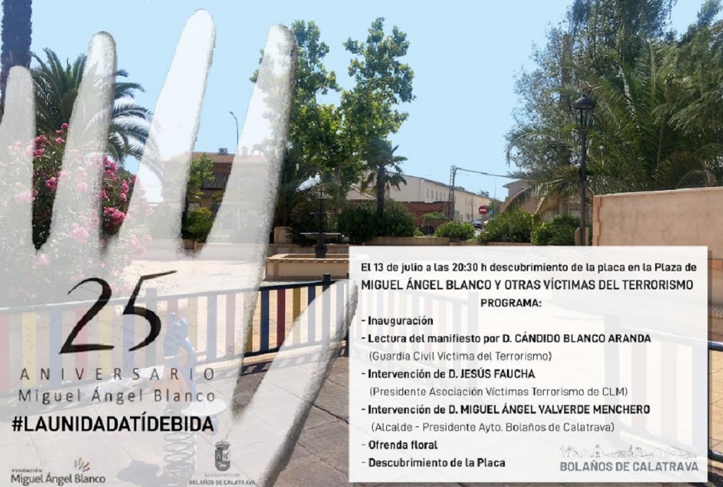 El 25º aniversario del secuestro y asesinato de Miguel Ángel Blanco a manos de la banda terrorista ETA, mañana miércoles, se conmemorará con el descubrimiento, a las 20:30 horas, de una Placa Conmemorativa en la Plaza de la urbanización Castilla-La Mancha que lleva su nombre ‘Miguel Ángel Blanco y Otras Víctimas del Terrorismo’.