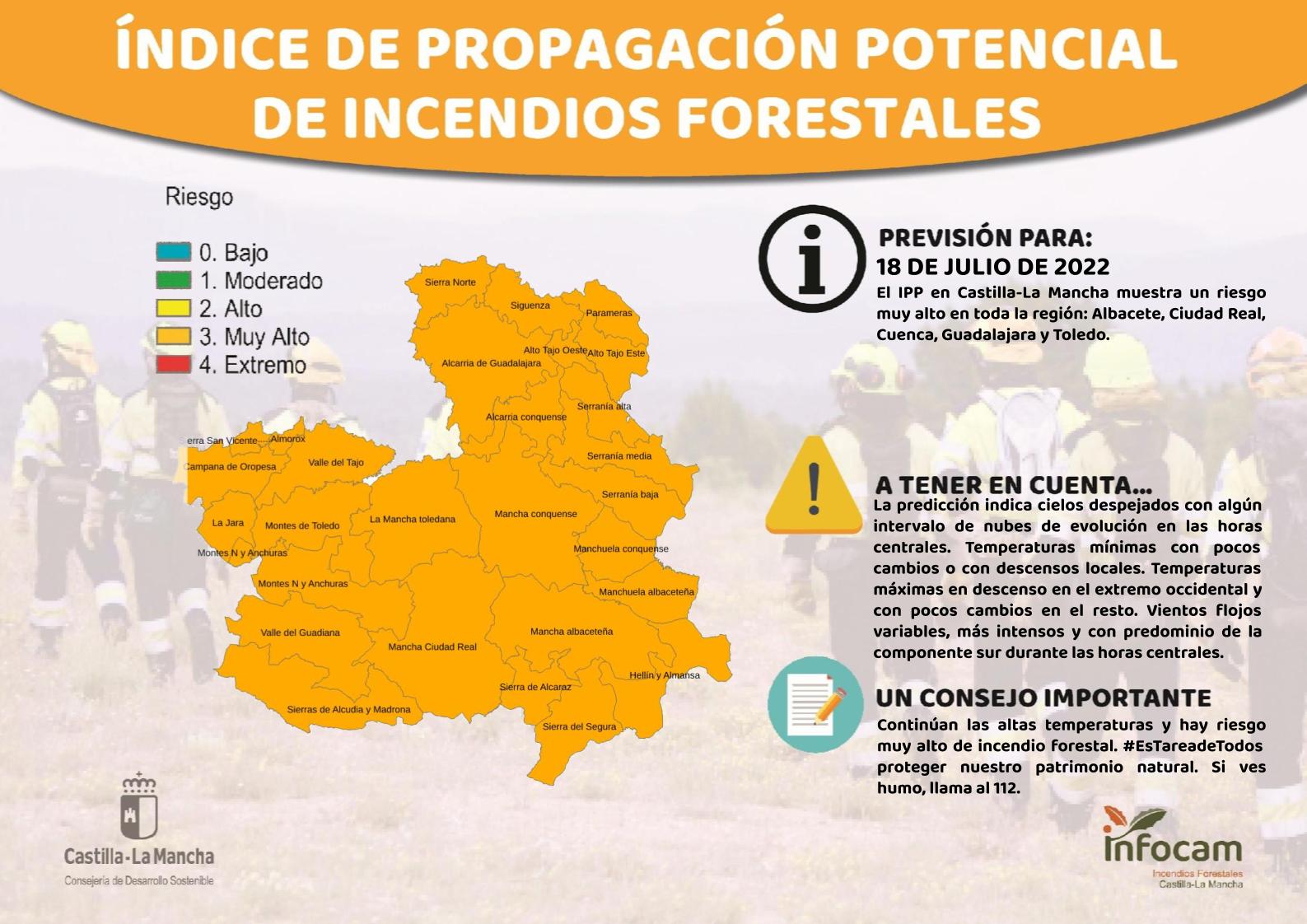 Índice de Propagación Potencial de Incendios Forestales (IPP) para este 18 de julio en C-LM.