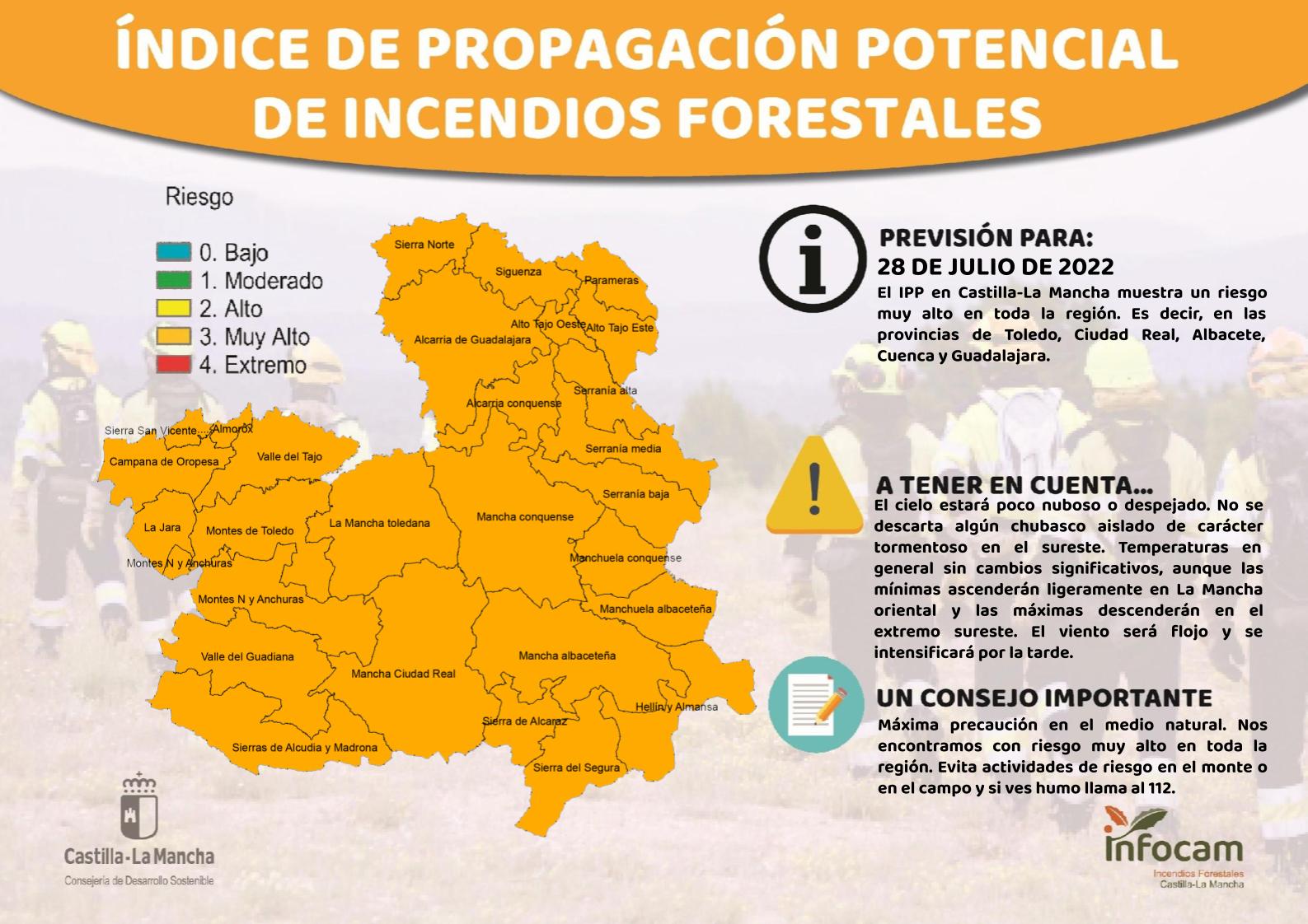 Índice de Propagación Potencial de Incendios Forestales (IPP) para mañana 28 de julio de 2022 en Castilla-La Mancha.