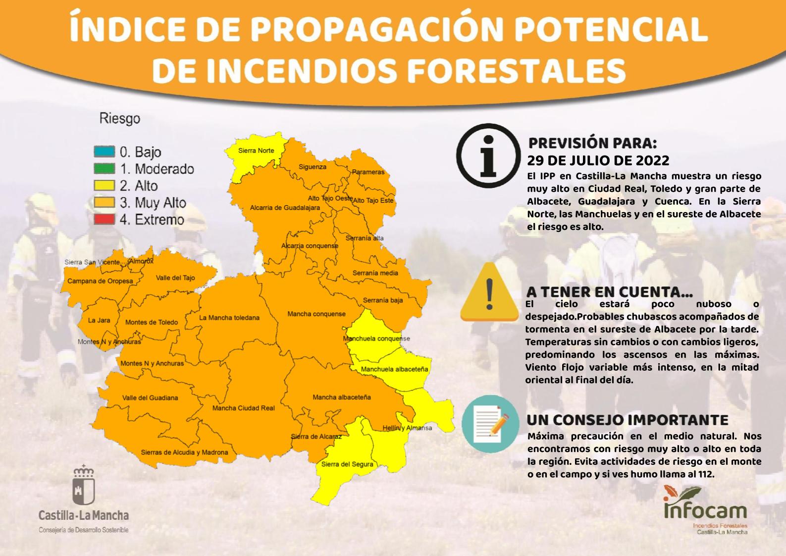 Índice de Propagación Potencial de Incendios Forestales (IPP) para mañana 29 de julio de 2022 en Castilla-La Mancha.
