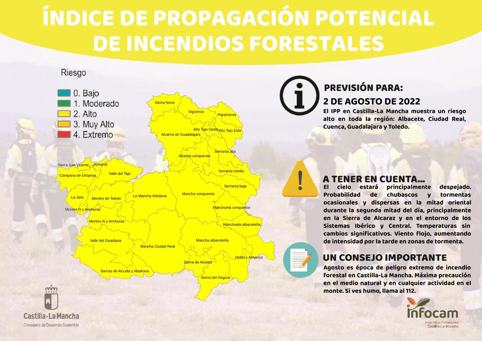Índice de Propagación Potencial de Incendios Forestales (IPP) para mañana 2 de agosto de 2022 en Castilla-La Mancha.