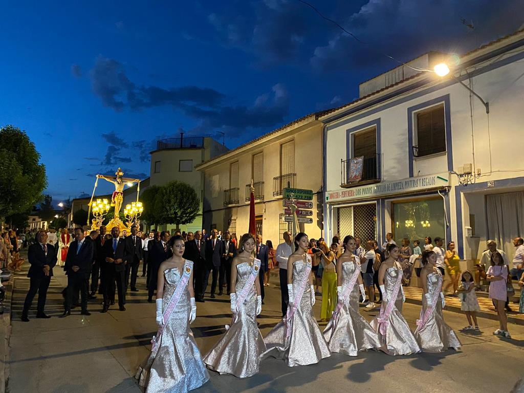 José Alberto Cruz, presidente de la hermandad patronal, le hacía entrega de un cuadro conmemorativo por su composición. Tras ello, criptanenses, miembros de las hermandades patronales, sacerdotes, las damas de honor, la Corporación municipal en pleno y la consejera de Igualdad y portavoz del Gobierno regional, Blanca Fernández, acompañaron al Cristo de Villajos hasta la Parroquia donde tuvo lugar un espectáculo de fuegos artificiales en honor al patrón de los criptanenses.