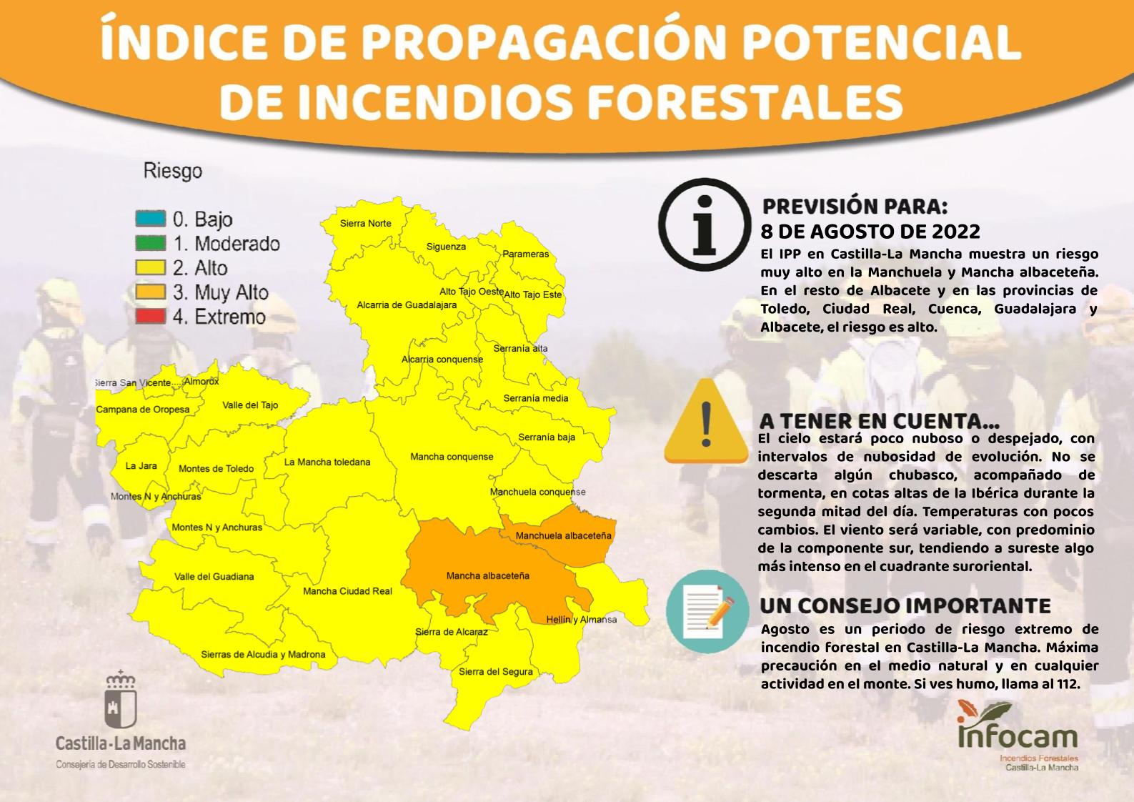 Índice de Propagación Potencial de Incendios Forestales (IPP) para mañana 8 de agosto de 2022 en Castilla-La Mancha.