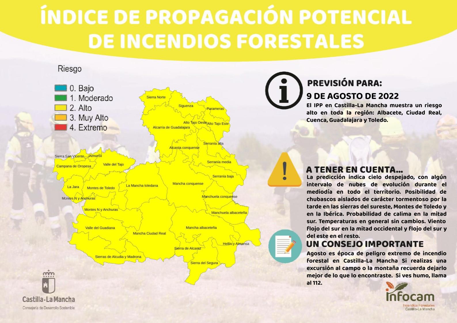Índice de Propagación Potencial de Incendios Forestales (IPP) para mañana 9 de agosto de 2022 en Castilla-La Mancha.