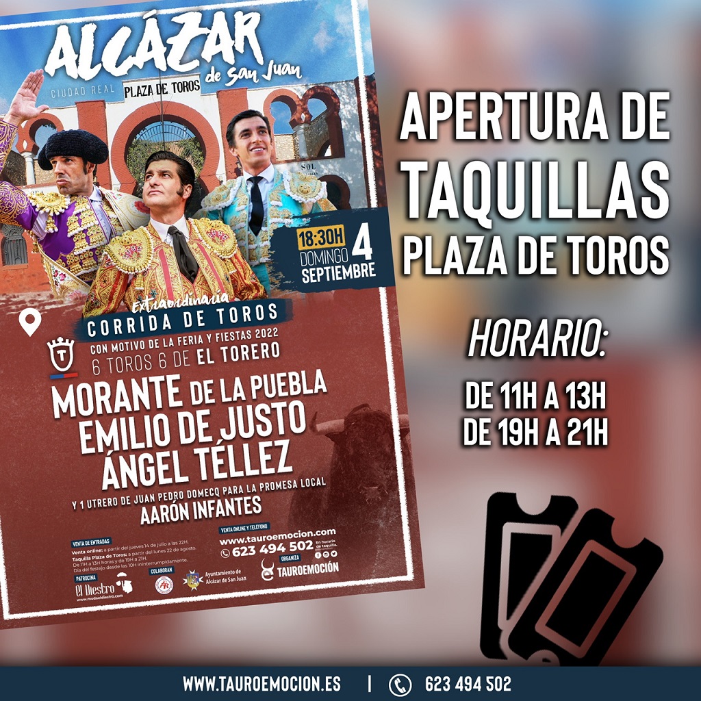 La empresa Tauroemoción abrirá mañana las taquillas físicas para la venta de entradas de los festejos programados en las localidades de Daimiel y Alcázar de San Juan el 3 y 4 de septiembre, respectivamente.