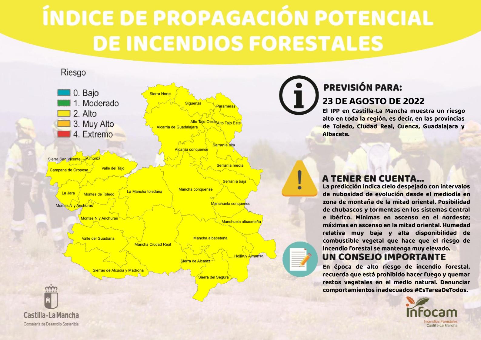 Índice de Propagación Potencial de Incendios Forestales (IPP) para mañana 23 de agosto de 2022 en Castilla-La Mancha.