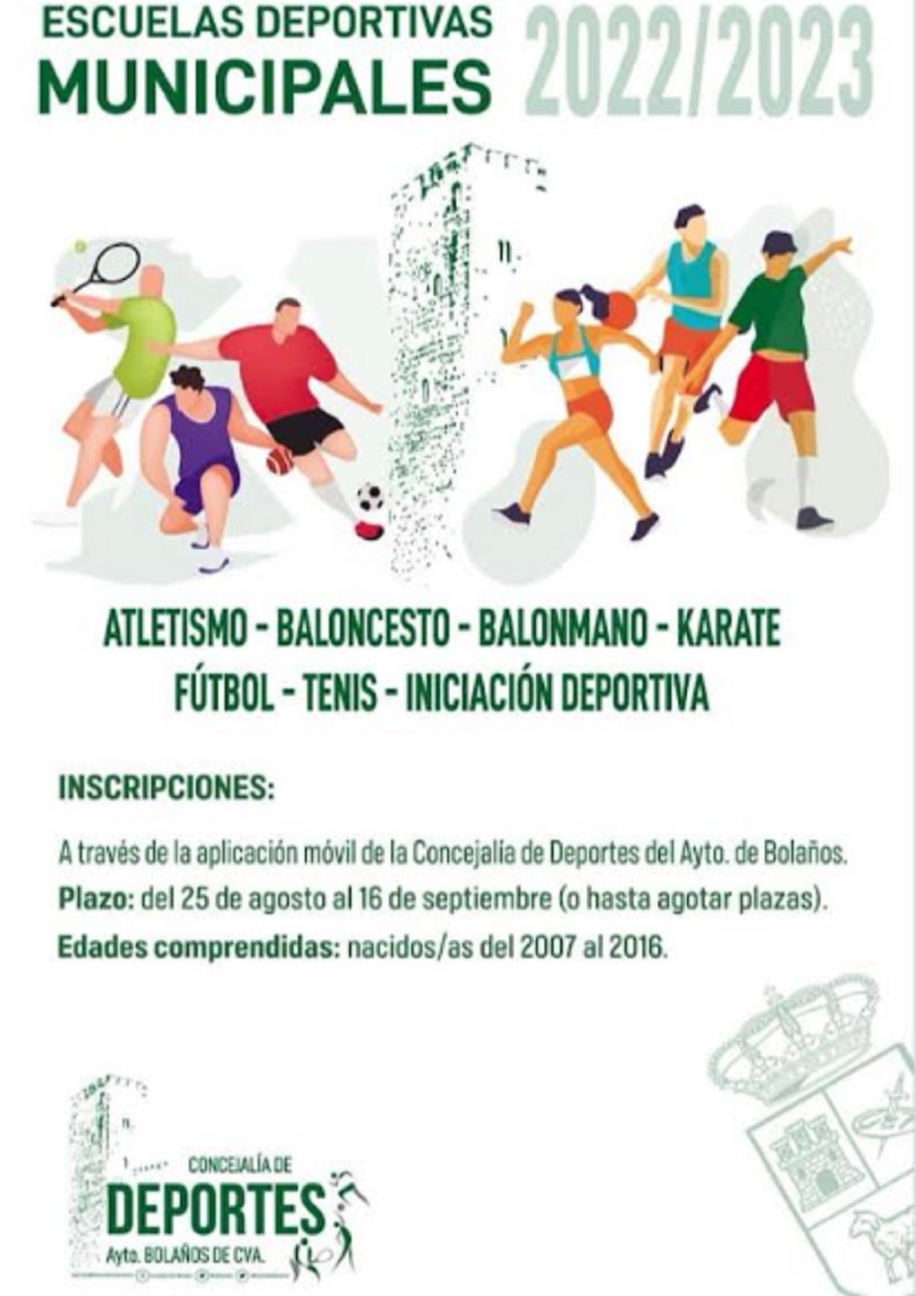 Hasta entonces, los padres, madres o tutores legales podrán inscribir a través de la aplicación móvil de la Concejalía de Deportes del Ayuntamiento de Bolaños a sus hijas e hijos nacidos entre 2007 y 2016, en las diferentes Escuelas Deportivas y según las edades establecidas en cada una de ellas.