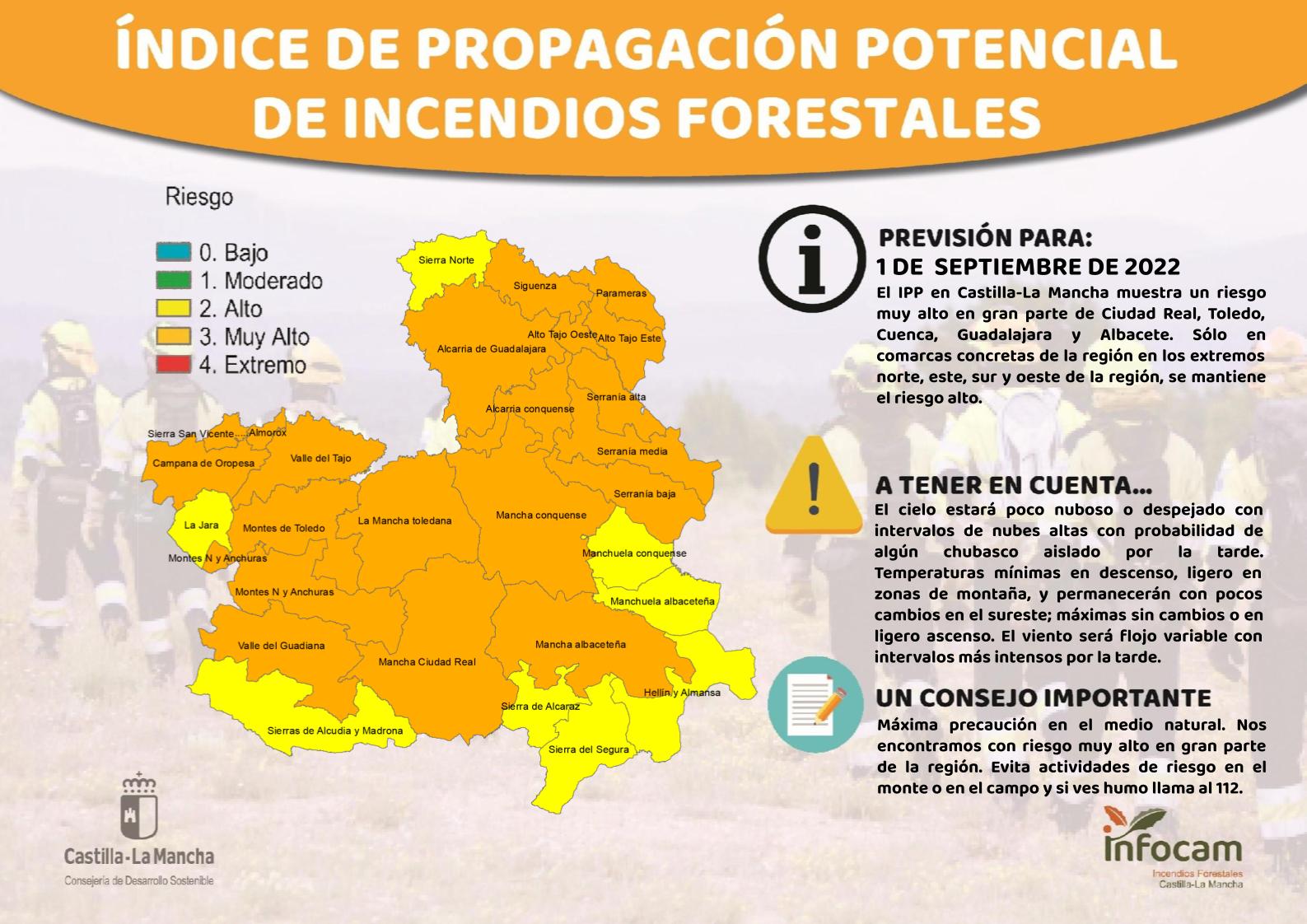 Índice de Propagación Potencial de Incendios Forestales (IPP) para mañana 1 de septiembre de 2022 en Castilla-La Mancha.