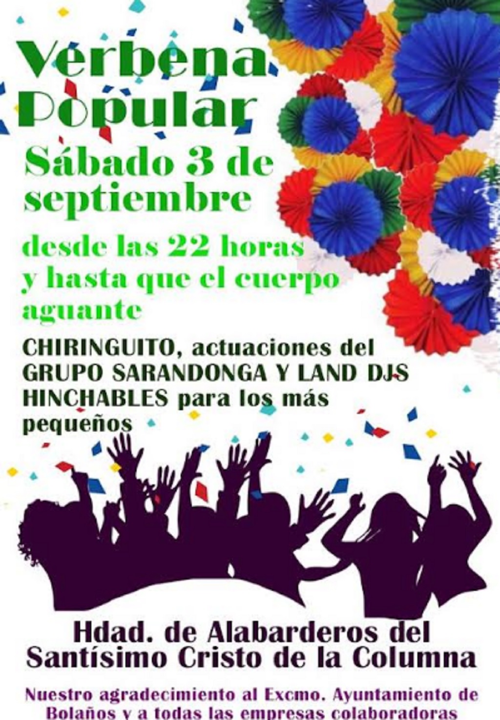 El sábado 3 de septiembre, la oferta cultural se multiplica por la noche, cuando la afluencia de bolañegos y visitantes en las calles y espacios festivos aumenta exponencialmente. La duplicidad se debe a la celebración de dos fiestas, por un lado, el concierto tributo a Paco Candela, ‘El crujir de mi montura’, incluido en la Semana Cultural de la Tercera Edad 2022; y por otro, la verbena popular organizada por la Hermandad de Alabarderos del Santísimo Cristo de la Columna en colaboración con el Excmo. Ayuntamiento de Bolaños.
