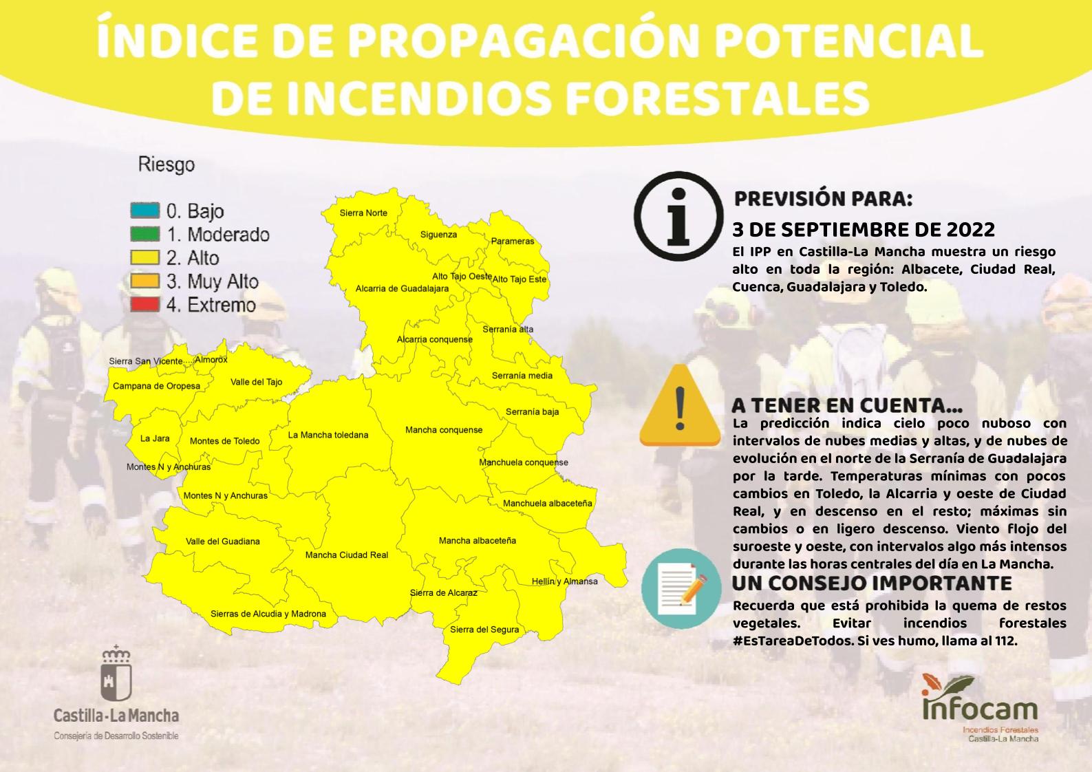 Índice de Propagación Potencial de Incendios Forestales (IPP) para mañana 3 de septiembre de 2022 en Castilla-La Mancha