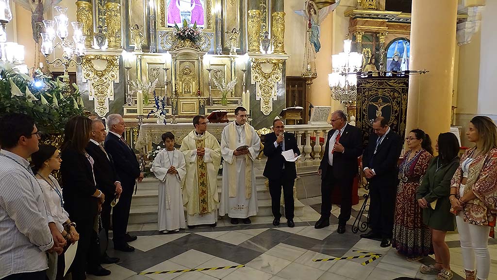 El presidente de la Hermandad-Mayordomía, Francisco Añover hacía entrega de una medalla a los mayordomos, camareras y servidor saliente como recuerdo de su paso por la Hermandad y les dirigía unas palabras manifestando que se acaba una etapa para los que concluyen el servicio a los Santos Patronos. “Podéis iros con la satisfacción del trabajo bien hecho gracias por el tiempo y los grandes momentos juntos, gracias por vuestro servicio, fervor y dedicación a la Virgen de la Piedad y el Cristo de Gracia”. Además, Añover también se dirigía a los nuevos miembros de la Hermandad-Mayordomía, deseándoles que disfruten del servicio a los patronos pues ven cumplido el sueño de todo quintanareño que es servir a la Virgen de la Piedad y el Cristo de Gracia.