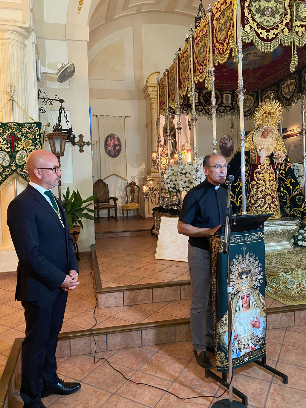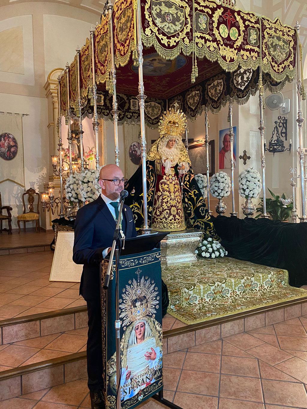 Durante su intervención, Alberca ha tenido palabras de agradecimiento para todas las personas que a lo largo de estos años han trabajado en pro de la hermandad y en la organización de esta exposición y de todos los actos programados, con un especial recuerdo a las mujeres que se encargan de la imagen de Mª Santísima de la Esperanza y de sus enseres.