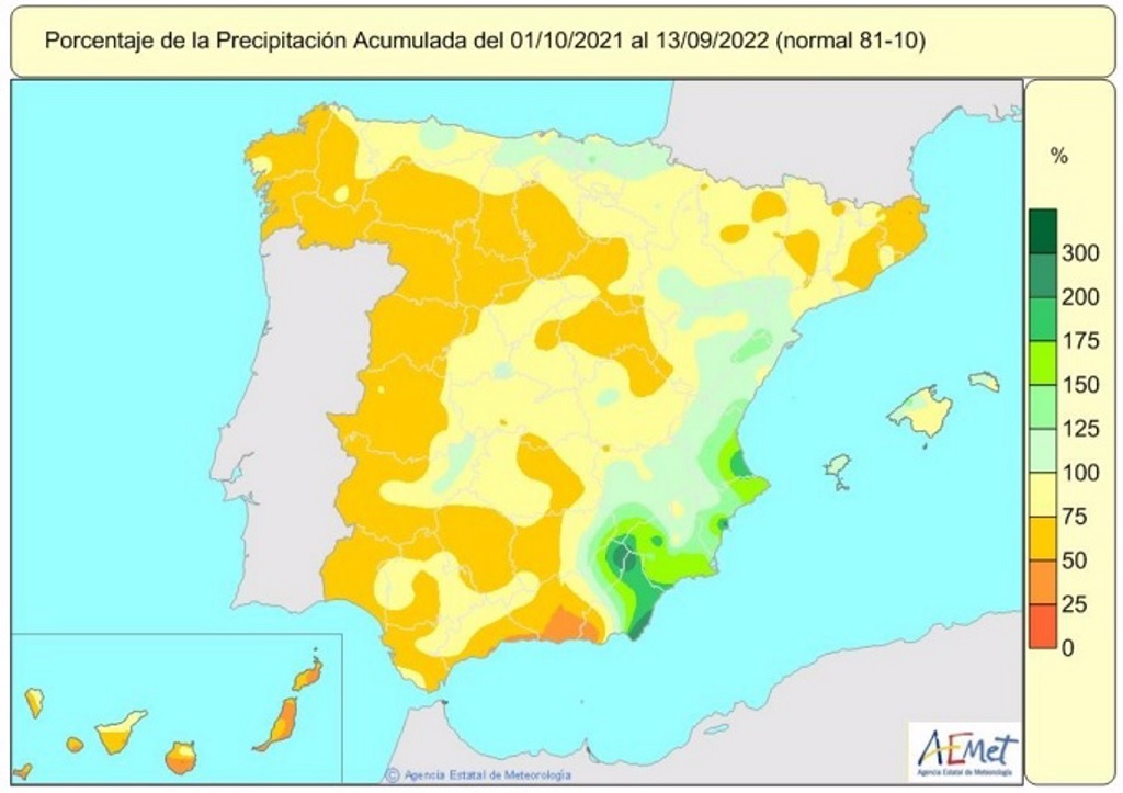 En concreto, el valor medio nacional de precipitaciones acumuladas desde el 1 de octubre de 2021 hasta el 13 de septiembre de 2022 es de 457 litros por metro cuadrado, un 25 por ciento menos de lo normal para ese periodo, que asciende hasta 612 litros por metro cuadrado.