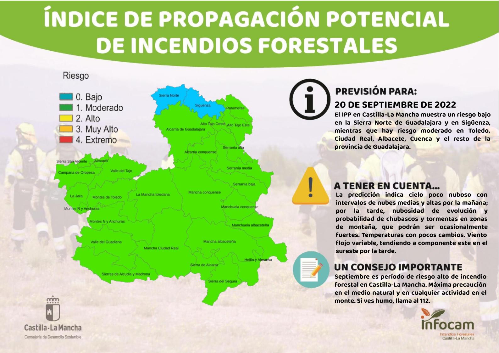 Índice de Propagación Potencial de Incendios Forestales (IPP) para mañana 20 de septiembre de 2022 en Castilla-La Mancha