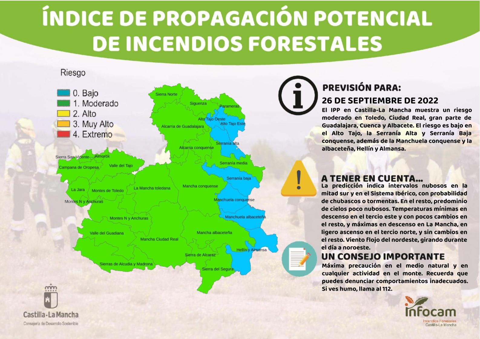 Índice de Propagación Potencial de Incendios Forestales (IPP) para mañana 26 de septiembre de 2022 en Castilla-La Mancha