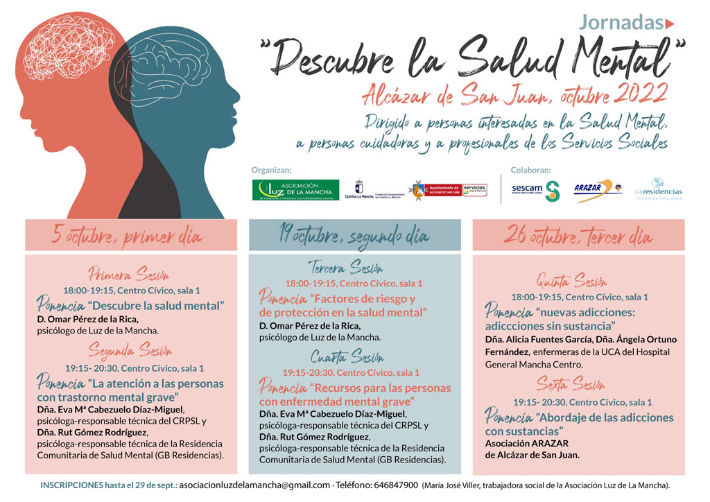 Unas jornadas, para conmemorar el Día Mundial de la Salud Mental el próximo 10 de octubre, organizadas por la Asociación Luz de La Mancha, Fundación Sociosanitaria de Castilla-La Mancha y el área de Servicios Sociales del Ayuntamiento de Alcázar de San Juan y que cuentan con la colaboración de la Residencia Comunitaria de Grupo GB Residencias, el SESCAM y la Asociación Arazar.
