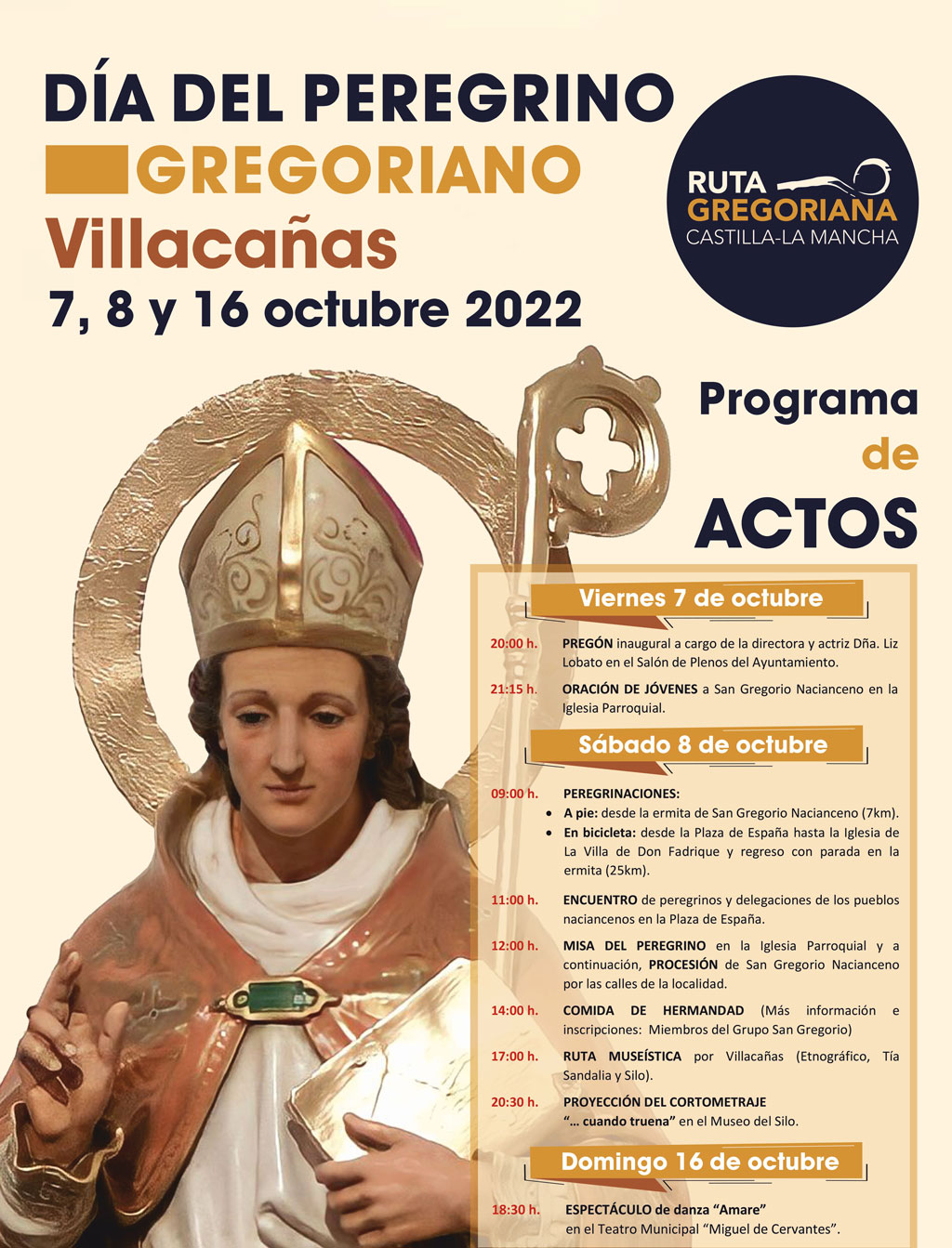 Los actos programados, organizados por el Grupo San Gregorio Nacianceno, la Parroquia de Ntra. Sra. De la Asunción y el Ayuntamiento de Villacañas, comenzarán este viernes 7 de octubre a las 20.00 horas con el Pregón inaugural por parte de la directora y actriz de la localidad, Liz Lobato, en el salón de plenos del Ayuntamiento. Posteriormente a las 21:15 horas tendrá lugar una Oración de jóvenes a San Gregorio Nacianceno en la Iglesia parroquial como acto de preparación espiritual para la jornada del sábado.